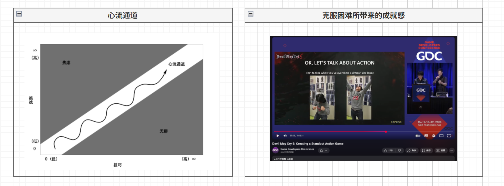 如上图右边,伊津野英昭在GDC2019《鬼泣5 创造一款杰出的动作游戏》的分享中说过:玩家在游玩过程中,因克服困难与挑战而获得的成就感,是动作游戏30年来始终不变的真理。