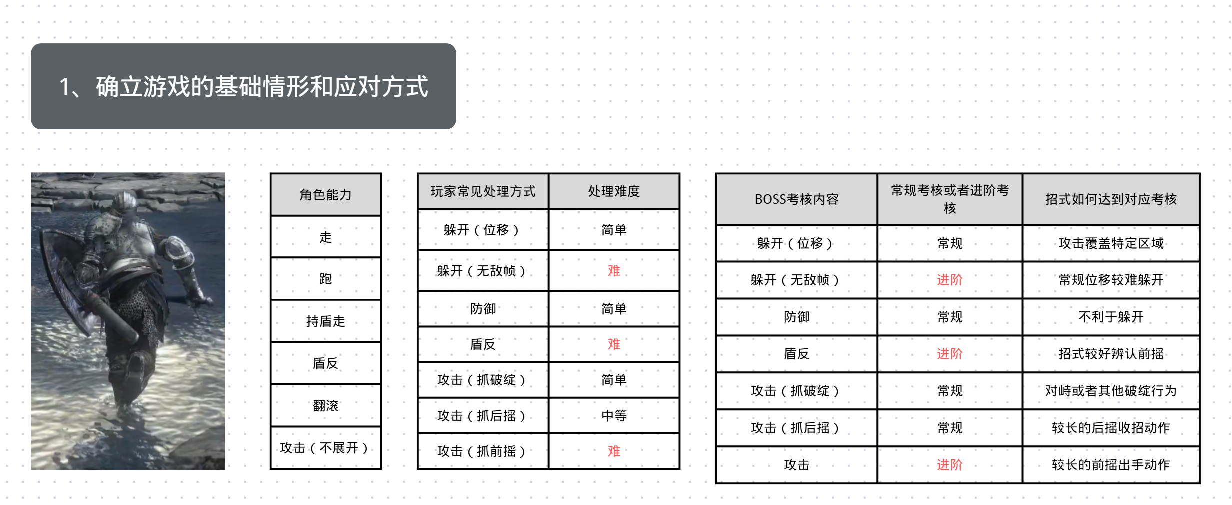 图中右边有一列很有意思,说的是如何让招式能达到筛选玩家行为的目的,客观来说,玩家往往能采取多种行为应对同一情形,为了达到我们的设计目的,我们需要有意识的让其他的行为无效或者低效。比如: