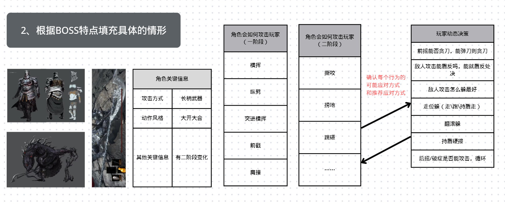 - 结合BOSS的设定与特征,设计独特且难度有差异的攻击动作,并思考每个攻击玩家的应对方式。
