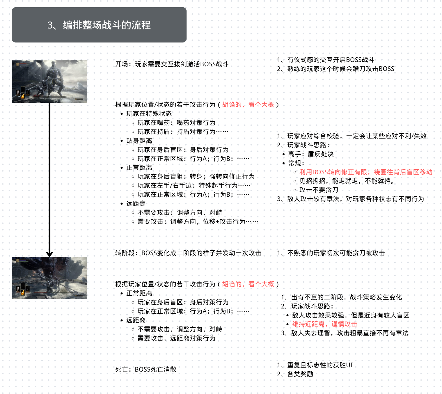 大部分BOSS的标准战斗时长要来到3分钟,微观上大部分游戏每若干秒(可以通过战斗时长/动作总数估算)会让玩家见识一个新动作,宏观上,长期持续不变的战斗节奏/策略会让玩家感到无聊,有意识的设计流程的变化是非常有必要的。