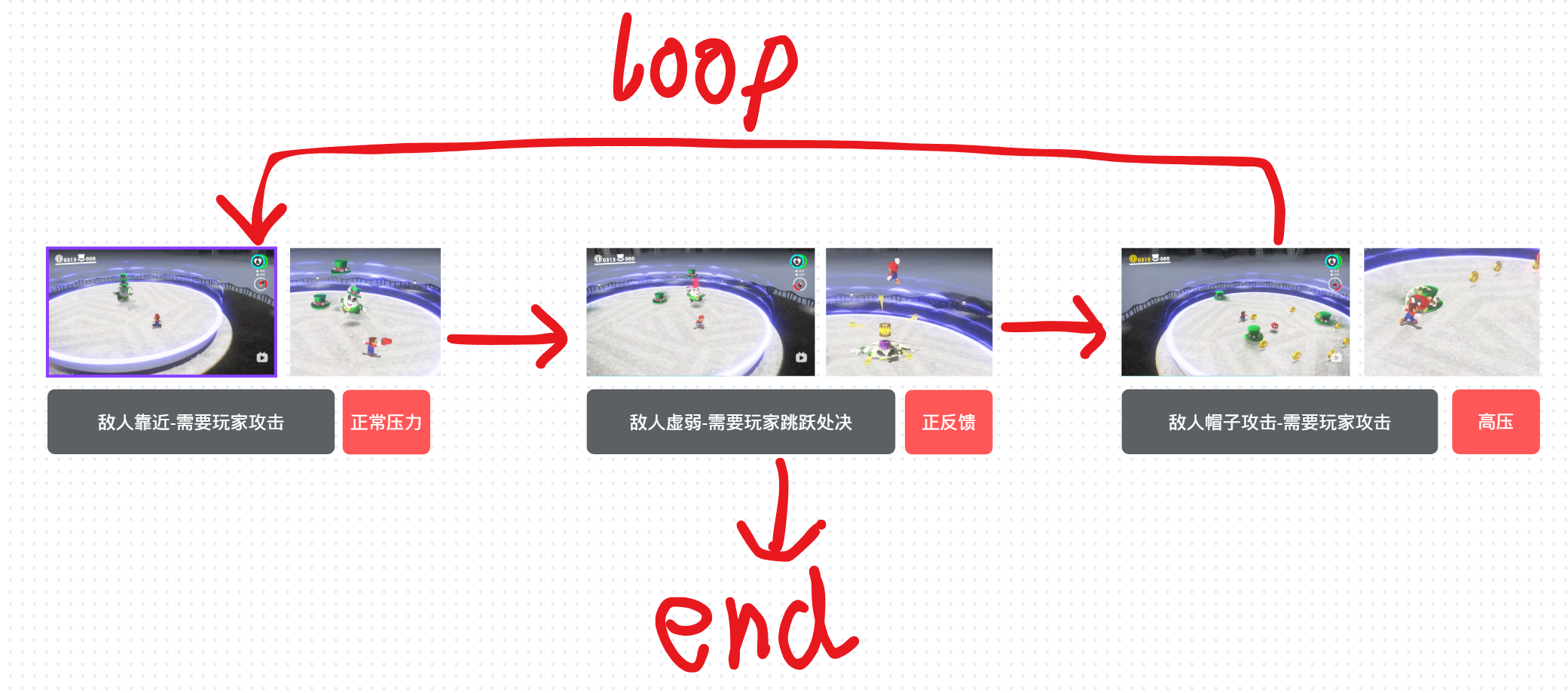 以《超级马里奥:奥德赛》为例,游戏里面的第一个BOSS帽子兔的流程如下图所示: