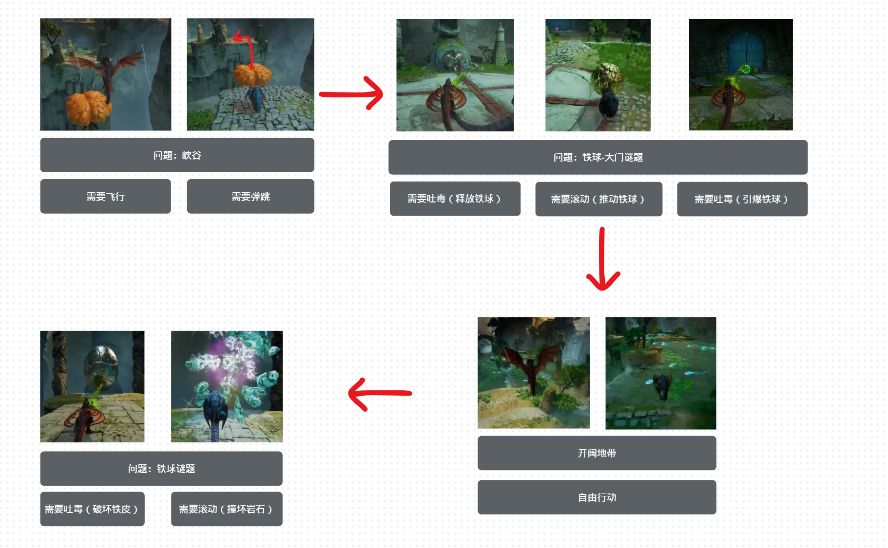 以《双影奇境》为例,游戏里面的第五章“龙魂”小节中的部分流程如下图所示: