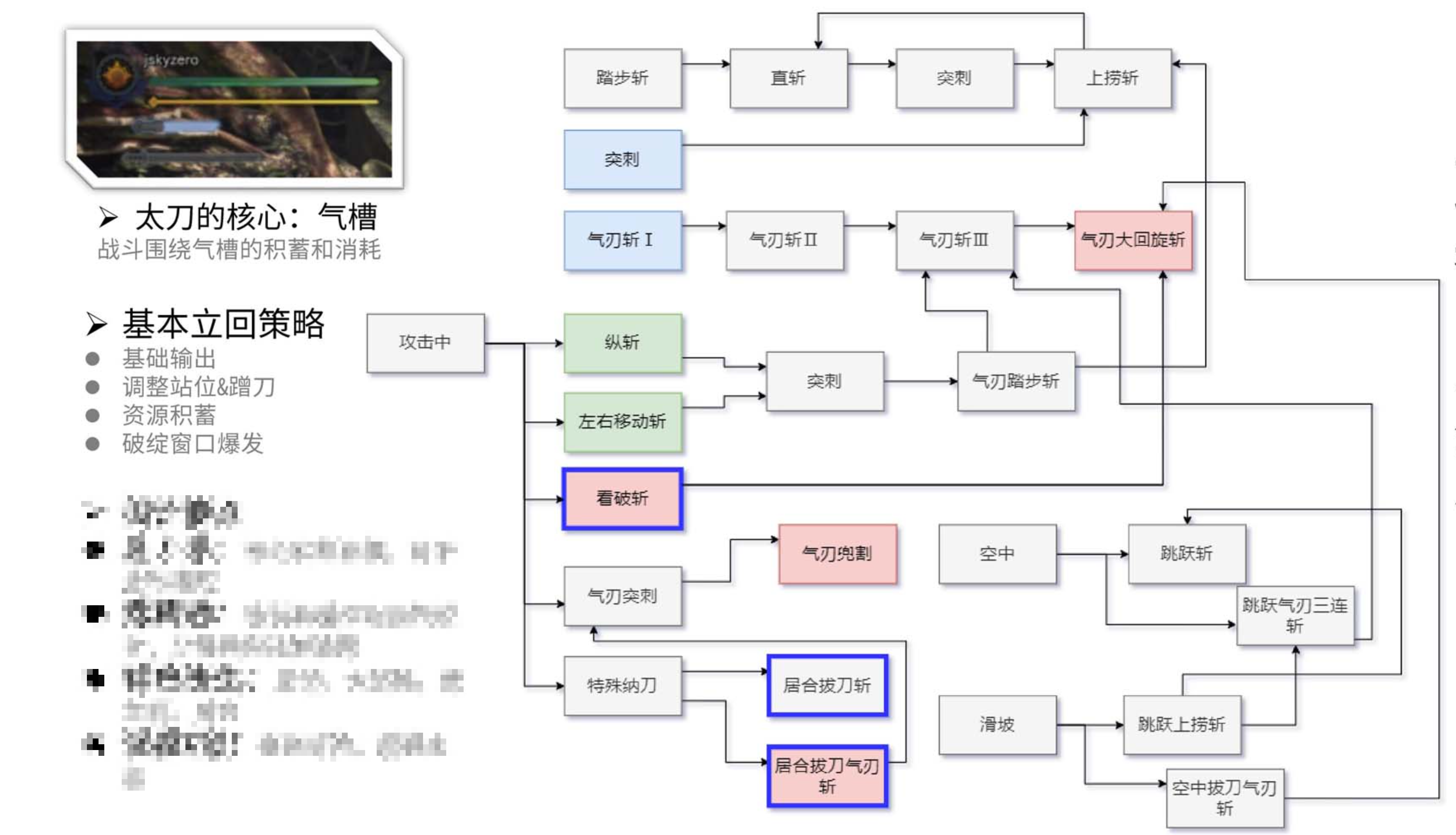 通俗来说,我们可以用“立回”(玩家调整选择优势位置)和“择”(根据情况挑选合适对策,猜也是一种挑选!)来描述格斗游戏或者说动作游戏的游玩过程,如果读者有一定动作游戏积累的话,对如何玩一个角色或者说如何打一些BOSS,肯定是有自己的心得的。我们这里以怪物猎人世界的太刀为例,太刀的招式派生状态机大致可以参考下图,下图左侧有一些关键词描述了对于太刀而言一些关键的行为:输出/调整战位&蹭刀/积累资源/爆发输出。