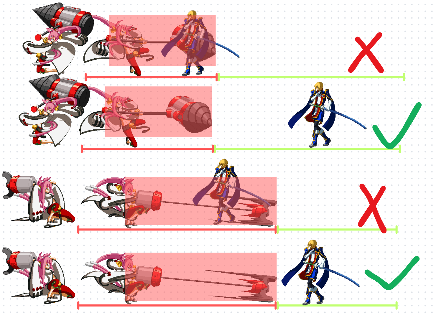 从这个角度,如果我们控制角色,在攻击框体到来之前,远离了攻击框判定区域,如上图2、4行绿勾所示,那我们就能避免被这次攻击命中。(或者反过来说,如果我们控制的是攻击方,那在攻击前,我们也需要确保攻击判定时,敌人要在我们的攻击范围内,这样攻击才能命中)