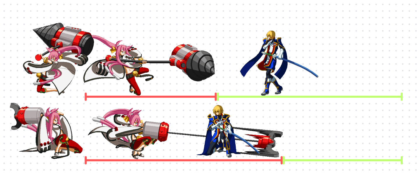 那,对于选择使用格挡策略的玩家,他就不必要位移到如此远的安全距离避开攻受击判定,而是可以在攻击框的覆盖区域中,使用格挡的攻击判定效果来应对这次攻击。如上图第二行所示。