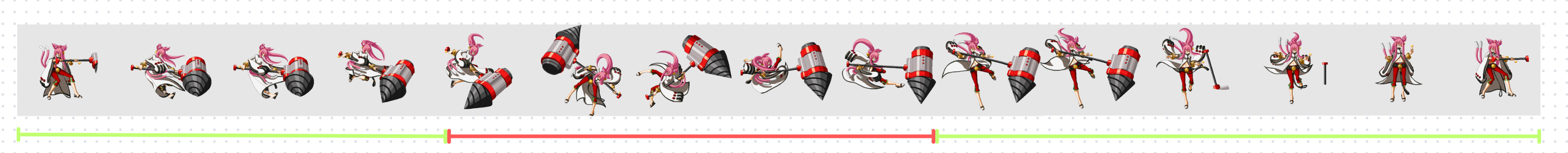 动作游戏最底层的铁律的上半部分,就是基于框体(或者其他范围限定)的判定机制,而且这些判定会和角色动画/特效等表现,严格绑定互相耦合。从实际制作的角度,这些将通过角色动画轴里的功能脚本序列来实现。
